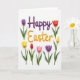 This design shows an overhead studio-style layout on a white background, with “Happy Easter” set in raised, sculpted lettering at the center. “Happy” sits on the top line in glossy purple, with rounded edges that catch the light like smooth icing. Just below, “Easter” appears in warm yellow, matching the same dimensional style and creating a friendly, welcoming contrast. Around the words, eight tulips form a balanced frame, their green stems and leaves leaning inward as if gathering close for a shared moment 🌷. The petals mix scarlet red, blush pink, sunny yellow, and two deep purples that echo the top word, giving the arrangement a gentle sense of togetherness 🐰. The text is centered and evenly spaced, with the purple line slightly above the yellow line so your eye reads top to bottom in one glance. The lighting is soft and even, leaving almost no shadows while highlighting the smooth letter surfaces and the fine veins in the tulip petals.