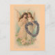 This Victorian image is of two angels standing in a bed of roses and holding a large heart-shaped flower wreath.