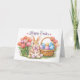 Celebrate the joy of spring with this charming Happy Easter greeting card, featuring a sweet watercolor bunny adorned with a soft pink bow, surrounded by blooming tulips and a basket of pastel Easter eggs.