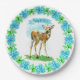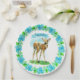 Enjoy the beautiful, turquoise blue floral wreath surrounding a young spring deer at your next Easter dinner party. Adorable watercolor of a fawn standing in green meadow with white dots looking back, and four little yellow chicks on top of it's back and head. A matching turquoise ribbon above that has "Happy Easter".