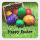 Happy Easter with colourful eggs in basket on green Square Sticker