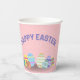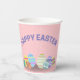 Happy Easter text with colourful Easter eggs on pink polka dot background pattern design.