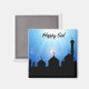 Black silhouette of a mosque on a blue sky with sun and sunrays.