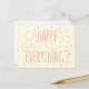 NewParkLane - Postcard, with fun quote 'happy everything' in pink, in modern typography, with sparkling stars, against a soft yellow background.