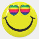 shining, happy face stickers in original, traditional yellow with rainbow hearts for the eyes! Put on a happy face with these bright and fun cute happy stickers! Give them out to your friends and remind them to put on a happy face! Celebrate and show the equality and love for all!