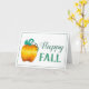 Cheery fall themed card perfect for sending September or October greetings! Card features an illustration of a bright orange pumpkin topped with a curly green stem. "Happy Fall" is inscribed next to it in charming teal script; a thin teal border surrounds the design.