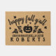 Classic and elegant doormat for the autumn season - "happy fall y'all" text with a pumpkin, vines, leaves, and your family name