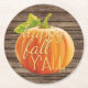 Happy Fall Y'all Orange Pumpkin on Planks Pattern Round Paper Coaster