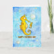 The background of this card is made of two different shades of blue, alternating to form a harmonious watercolor background. Here and there some airbubbles are slowly rising to the surface. In the foreground there two yellow seahorses, a small one and a bigger one. They are smiling at each other.