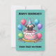 This delightful greeting card radiates joy with its playful design, featuring a gleeful pug popping out of a colourful birthday cake. The cake is beautifully decorated with pink icing and multicolored dragees, set upon a plate with candy canes, symbolising a festive treat. Surrounding the pug are buoyant balloons in shades of blue, green, purple, and pink, contributing to the celebratory atmosphere.