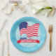 An illustration of the American flag waving in the wind, with text that says Happy Fourth of July with navy blue stars above the text. Below that is a red banner ribbon with the words Independance Day. Behind the illustration is a pale green circle. Set on a sky blue background with a grunge vintage style watercolor texture with faded stripes going across.