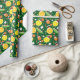 Wrapping paper with a pattern of smiling fruit and vegetable cartoons wearing santa hats on a green background. The foods include lemons, oranges, green peas, and carrots.