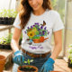 If you enjoy gardening then you will love this T-shirt. This white t-shirt features potting stations with purple Viola flowers, watering can and other garden needs. I added an overlay of a bird and a butterfly and feel that they make this design perfect. Buy this summer white tee for yourself or as a gift to another gardener.