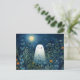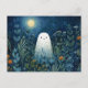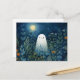 Charming illustration of a smiling ghost glowing under the full moon, surrounded by tall flowers and leaves in a whimsical nighttime garden.