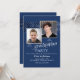 A blue invitation with a ribbon in blue and black and two framed photo windows. Ideal for sibling graduations and twin graduations.