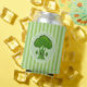 Green cartoon broccoli with a big happy smile on a green stripy background.