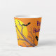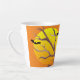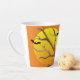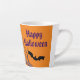 Enjoy your coffee in this "Spooktacular" latte mug. This halloween theme features a bright yellow full moon on an orange background, with a tree branch and three bats in the foreground. The "Happy Halloween" text can be customised. Design wraps around the mug.