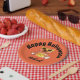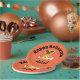 Custom party supply with your name. ©PLdesign Cute Brown bear with trendy orange sun glasses holding funny smiling pumpkin for Halloween.