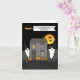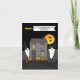 A simple illustration of a spooky haunted house at nigt, complete with ghosts, pumpkins, bats and bones. A plane is flying over the house and it has a banner behind it that says 'Happy Hallloween birthday to a very special grandson'.