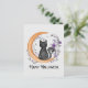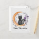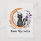 Celebrate spooky season with elegance using this whimsical Halloween postcard featuring a black cat sitting on a crescent moon, beautifully surrounded by purple flowers, and accented by the festive phrase “Happy Halloween.” Perfect for cat lovers, moon magic fans, and those who adore a softer, more enchanted take on Halloween.