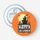 Happy Halloween text design illustration with haunted house, cemetery and bats decoration at full moon on grunge orange background