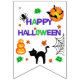This bunting banner feature the words "Happy Halloween" in a spooky style print font with purple and green letters surrounded by a collection of Halloween themed decals in this spooky theme and style. All banners have single sided printing outdoor safe made with sturdy plastic polystyrene and thick plastic rope has (16) 5.5" x 8" swallowtail flags on a 6' long string.
