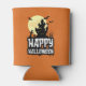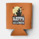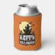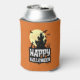 Happy Halloween text design illustration with haunted house, cemetery and bats decoration at full moon on grunge orange background