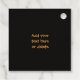 Halloween themed favour tag features spooky pumpkin, bats, spiders, and full moon in the background. Customisable text on the back in matching orange colour on black background.