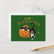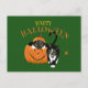 This postcard showcases the playful nature of cats during Halloween, featuring two black and white geometric cats having a good time with the words 'Happy Halloween' . One cat is using a pumpkin as a hideout, adding an extra element of fun to the design.