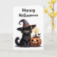 Happy Halloween greeting card featuring a cute black cat wearing a witch's pointy hat. Use the "Personalise this template Details" link to change the inside greeting. AI assisted graphic purchased with commercial use. Artwork: RedHeronLighthouse