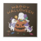 Happy Halloween! A cute illustration of cats and a ghost looking at treats in a Halloween pumpkin bucket