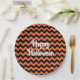 This black paper plate with orange and black chevron design has a Happy Halloween message for your party guests.