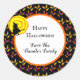 A cute, custom Happy Halloween sticker with a witch flying across a full moon on a colourful pattern of candy corn in yellow, orange and purple, with rustic and curly letters.