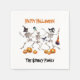 Happy Halloween dancing skeletons with witches hats and broom, pumpkins, and bats