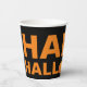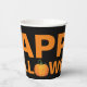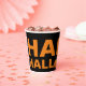 For those who don't like a lot fuss or frills this paper cup features a simple design with type. This Halloween theme cup features a basic black background. In orange, the words "HAPPY HALLOWEEN" wrap around the mug. There is an image of a pumpkin in place of the "o", in the word "HALLOWEEN".