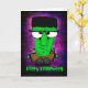 Happy Halloween card featuring an adorable hand drawn cartoon Frankenstein. Interesting background with blues, purple, pinks, and faint halloween text. A fun way to wish someone Happy Halloween