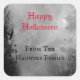 A custom Happy Halloween sticker in red blackletter and black rustic letters against a Halloween sky with misty trees, gothic ravens and a cloudy full moon in black, white and grey.