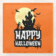 Happy Halloween text design illustration with haunted house, cemetery and bats decoration at full moon on grunge orange background