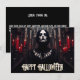 Gothic-inspired Happy Halloween design featuring a mysterious figure in black with dramatic makeup, set among red candles and dark cathedral pillars. Perfect for spooky greetings, eerie atmosphere, and creative seasonal visuals.