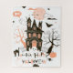 Perfect for Halloween! This cute design features an orange and black motif with a haunted house front and center, with two bare trees on either side. A full moon aboce, with a ghost saying BOO, a bat, a jack o'lantern on the lawn and a black cat all add to the Halloween ambiance.