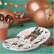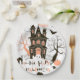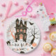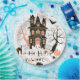 Perfect for Halloween! This cute design features an orange and black motif with a haunted house front and centre, with two bare trees on either side. A full moon aboce, with a ghost saying BOO, a bat, a jack o'lantern on the lawn and a black cat all add to the Halloween ambiance.