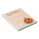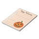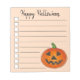 List-style note pad design features an original marker illustration of an orange jack o' lantern carved pumpkin, with HAPPY HALLOWEEN in a fun font.