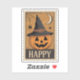 This festive postage stamp features a cheerful jack-o'-lantern donning a classic witch's hat, set against a warm, autumnal background with a crescent moon, star, spider, and web details. Below the playful imagery, the word "HAPPY" is prominently displayed, hinting at a full "Happy Halloween" message. Ideal for sending holiday greetings, party invitations, or for collectors, this stamp adds a fun and spooky touch to any mail or display.