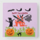 Wishing you a delightfully spooky Halloween! The design features a hauntingly orange house at the centre, with a ghost soaring above and a raven perched on its roof. To the house's left stands a menacing tree bark with arms. "Happy Halloween" is inscribed above in a 'dripping blood' style font. Three bats flutter atop the scene, while below, green hands emerge from the earth, flanking two eerie orange pumpkins with an arched black cat nestled between them. It's a perfect design for all Halloween enthusiasts.