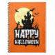 Happy Halloween text design illustration with haunted house, cemetery and bats decoration at full moon on grunge orange background