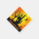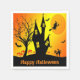 White paper napkin with haunted house background and orange Happy Halloween font.