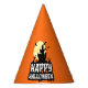 Happy Halloween text design illustration with haunted house, cemetery and bats decoration at full moon on grunge orange background