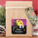 This fun and spooky sticker features cute mummies beside a crooked haunted house. In the background is a full moon with bats and a pink night sky with stars. The text combines decorative and serif fonts for a stylish and modern look. This is perfect for a Halloween party.