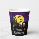 This fun and spooky paper cup features cute vampires beside a crooked haunted house. In the background is a full moon with bats and a purple night sky with stars. This is perfect for Halloween.