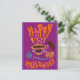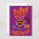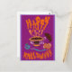Original illustration of a cat lover witche’s cup of coffee with poisonous potion, witch a bat, pumpkin, magic wand and little steam ghosts with hand lettering saying Happy Halloween. In orange and purple bold maximalist style and colours.